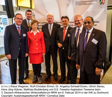 Eröffnet hat das Forum u.a. die Ministerin für Bundesangelegenheiten, Europa und Medien des Landes NRW, Dr. Angelica Schwall-Düren. Die Ministerin lobte die Anwesenheit der afrikanischen Botschafter sowie wichtiger Institutionen und Unternehmerpersönlichkeiten und beschrieb die Bedeutung und die Perspektiven des afrikanischen Kontinents für die deutsche Wirtschaft wie folgt: „Afrikas wirtschaftlicher Aufstieg ist in aller Munde und es besteht kaum ein Zweifel daran, dass der afrikanische Kontinent heute und in näherer Zukunft ein Wachstumsmarkt von globaler Bedeutung ist und bleiben wird. […] Afrika wird der dynamischste globale Wachstumsmarkt in den kommenden Jahren, wenn nicht des Jahrzehnts sein und bietet auch Unternehmen aus Deutschland und natürlich damit auch aus Nordrhein-Westfalen erhebliche wirtschaftliche Chancen. Dies gilt vor allem in Brachen wie der Infrastruktur und im Bauwesen, in der Logistik oder bei erneuerbaren Energien und in der Umwelttechnik, die in Afrika stark wachsen werden […]. Speziell aus Sicht von NRW sollten sich daneben vor allem der klassischen Bergbautechnik und der klassischen Bergbauzulieferern große Chancen auf dem afrikanischen Markt ergeben. Es kommt hinzu, dass wir Deutschen mit unseren Sekundärtugenden Verlässlichkeit, Pünktlichkeit und Präzision und mit der Qualität deutscher Produkte auch in Afrika einen außerordentlich guten Ruf genießen.“