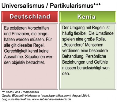 Das folgende Beispiel macht das unterschiedliche Zeitverständnis deutlich: Wenn sich ein Deutscher bei einem Termin verspätet, wird er sofort anrufen und ein sehr präzises Zeitfenster für seine Ankunft nennen. Ein Kenianer hingegen wird nicht anrufen, geschweige denn sich am nächsten Tag entschuldigen, dass er zum Termin nicht erschienen ist. Für Deutsche ist dies ein Zeichen von Unzuverlässigkeit. In Kenia jedoch gilt: Je wichtiger der Status einer Person, desto später erscheint sie zu einem geschäftlichen Termin. Auch erwartet ein deutscher Geschäftsmann den zügigen Abschluss von Verhandlungen, an deren Ende er den Abschluss eines Vertrages erwartet. Der Kenianer hingegen pflegt einen flexiblen Umgang mit Zeit und Fristen.