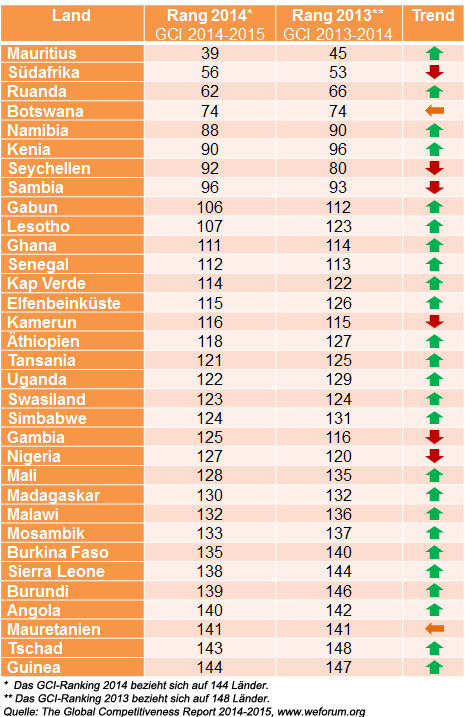 Das am besten platzierte Land aus Subsahara-Afrika ist Mauritius auf Platz 39. Südafrika folgt auf Rang 56, Ruanda (62), Botswana (74), Namibia (88), Kenia (90), die Seychellen (92) und Sambia (96) befinden sich ebenfalls unter den 100 wettbewerbsfähigsten Ländern. Das Gros der Länder Subsahara-Afrikas, nämlich 25 Staaten, findet sich allerdings auf den hintersten Plätzen (106 bis 144) des Rankings wieder.