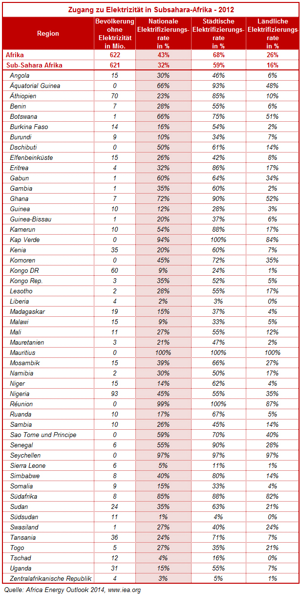 Laut AEO ist der Energiebedarf in der Region Subsahara-Afrika zwischen 2000 und 2012 um 45 % gestiegen. Nigeria und Südafrika alleine sind für 40 % der gesamten Energienachfrage verantwortlich. Strom aus Biomasse macht mit 60 % das Gros des Energiemixes aus, gefolgt von Kohle (18 %), Öl (15%), Gas (4%) sowie den erneuerbaren Energien (2%). 2012 hatte Subsahara-Afrika eine Kapazität von 90 Gigawatt netzgebundener Energie, 45 % davon aus Kohle, 22 % aus Wasserkraft, 17 % aus Öl und 14 % aus Gas.